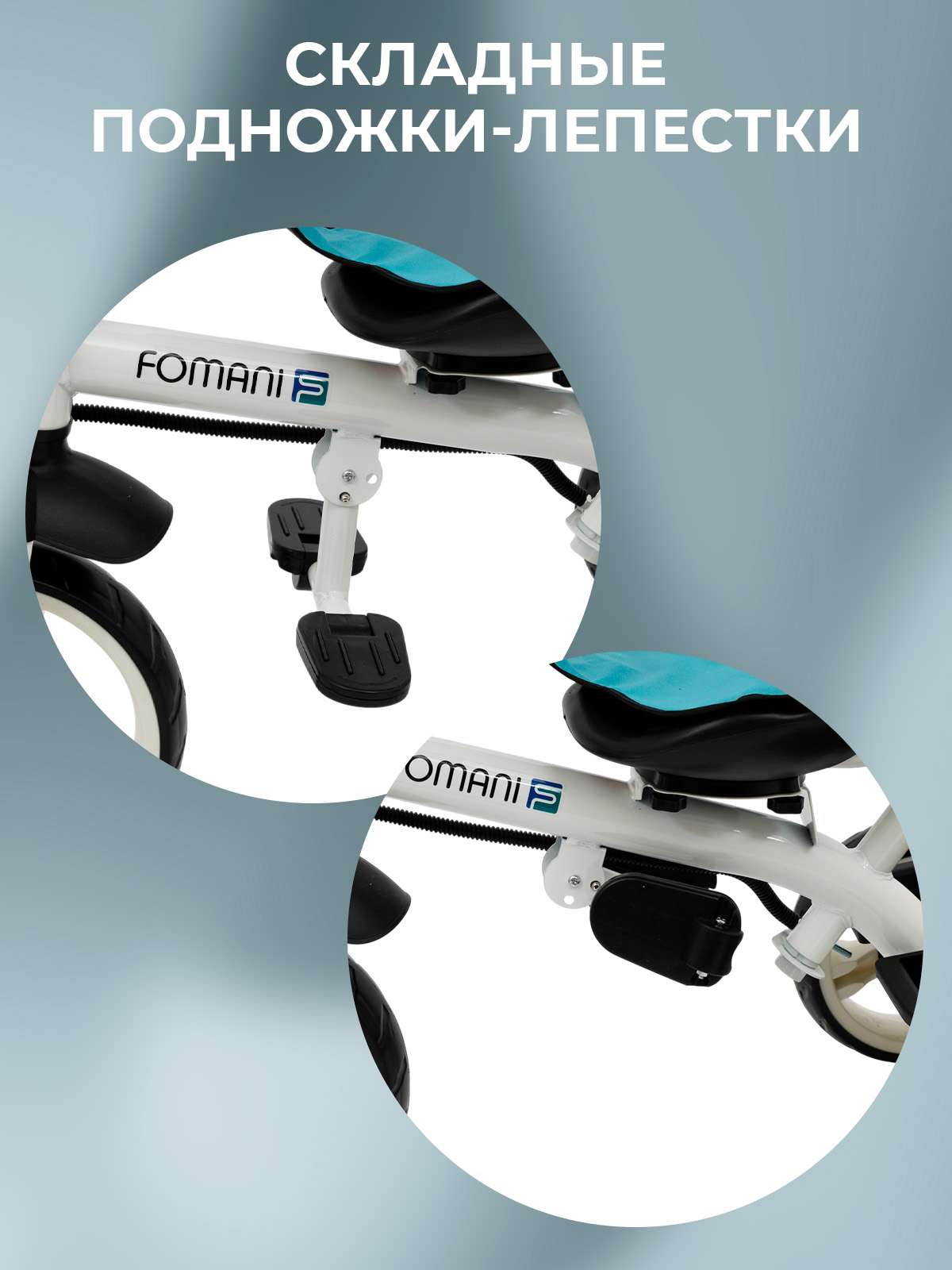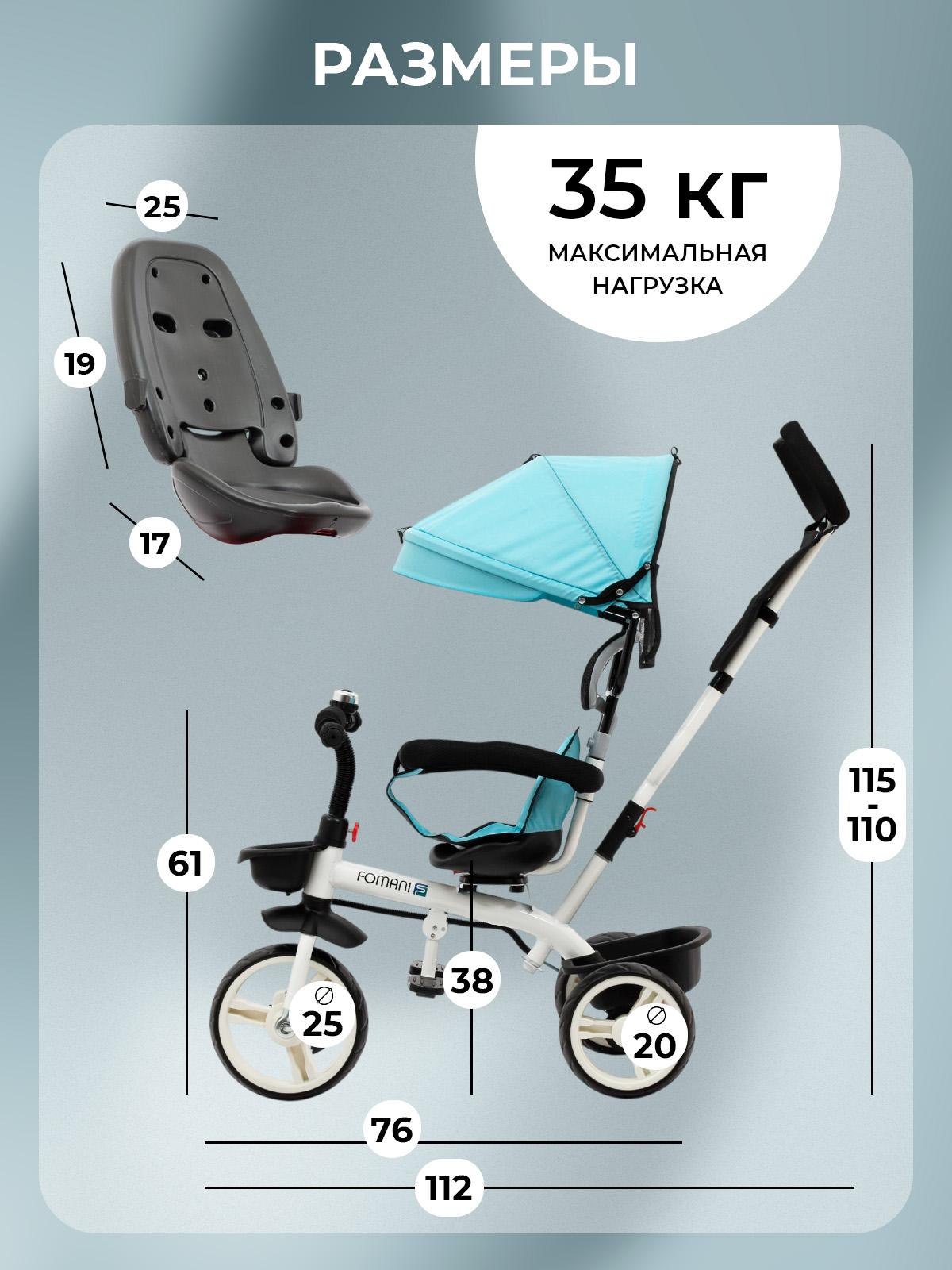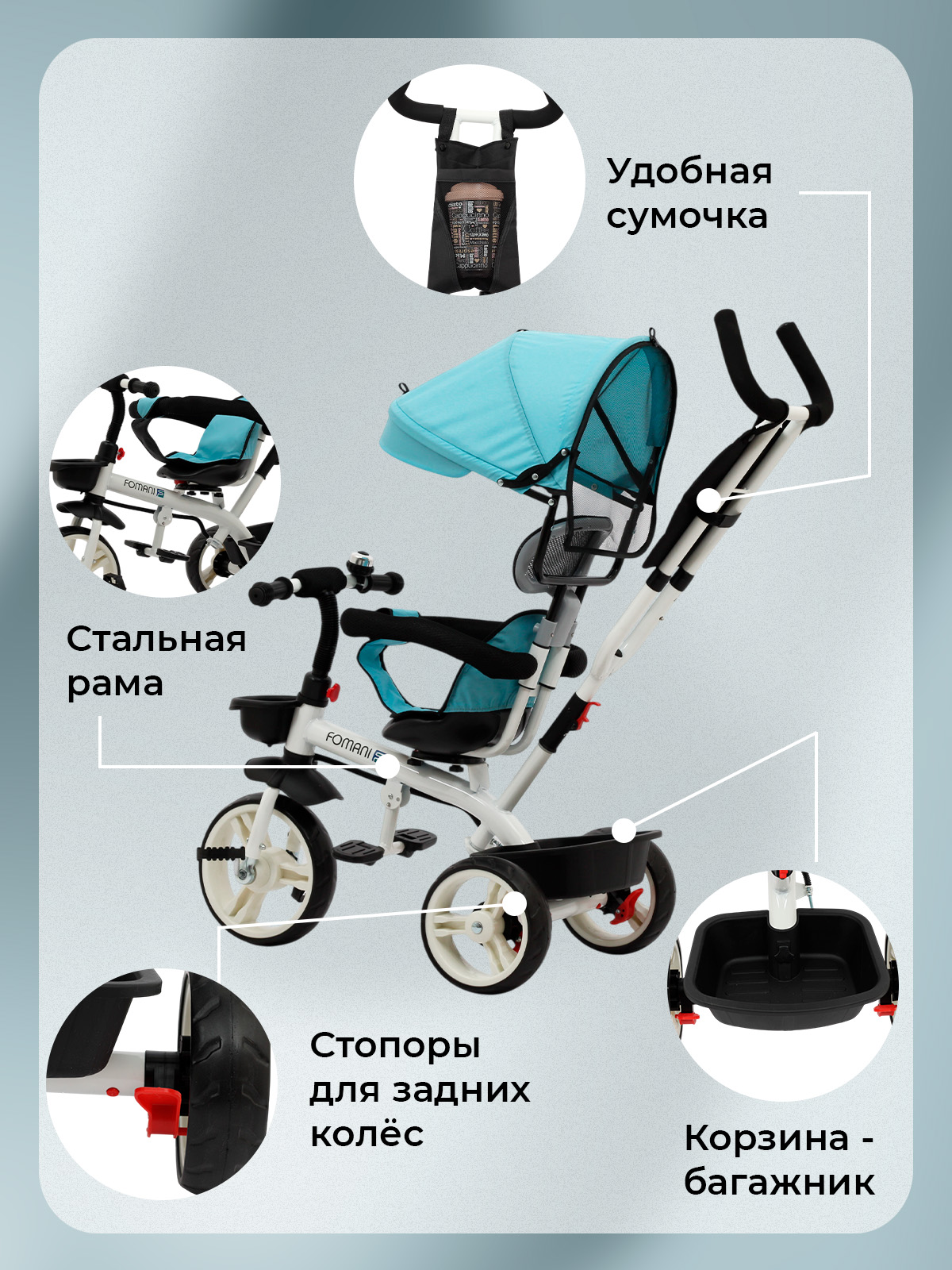 Трехколесный велосипед с родительской ручкой FOMANI 6188 отлично подойдет для прогулки с ребенком в теплый сезон. Велосипед оснащен колесами из прочного EVA материала 10 и 8 дюймов, которые обеспечивают мягкий ход даже на неровной поверхности. Велосипед подходит для деток в возрасте от 1 до 4 лет. Конструкцией предусмотрен складной защитный капор, который можно поднять или опустить, в зависимости от погодных условий.