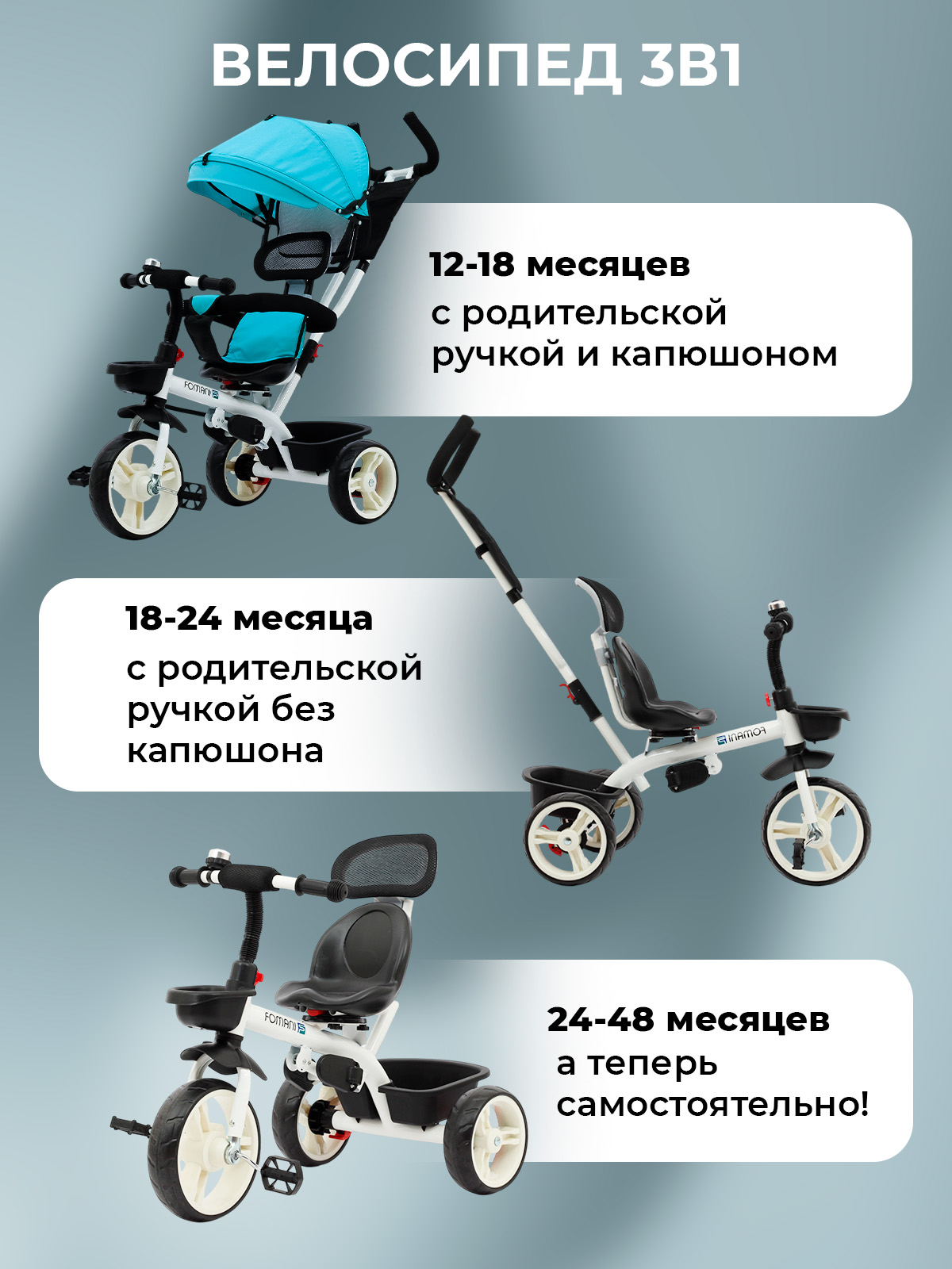 — трансформируется в 3-х колесный велосипед для самостоятельной езды;