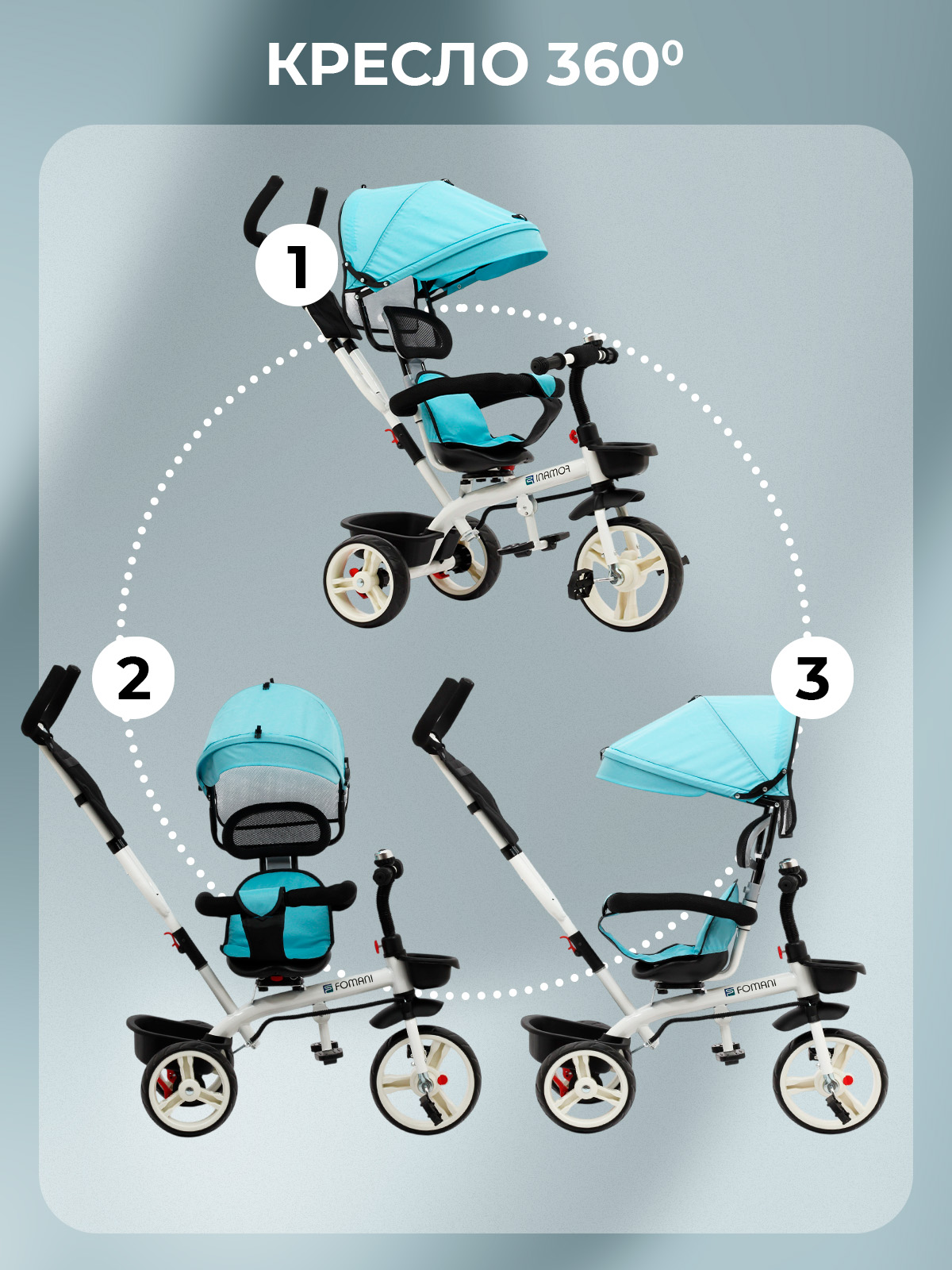 Вентилируемое окошко, Звонок, Козырек от солнца, Корзина для вещей и покупок, Мягкий защитный бампер, Подножка, Сумочка для мелочей, Поворотное сиденье на 360, Родительская ручка, Съемная обивка, Задний стояночный тормоз