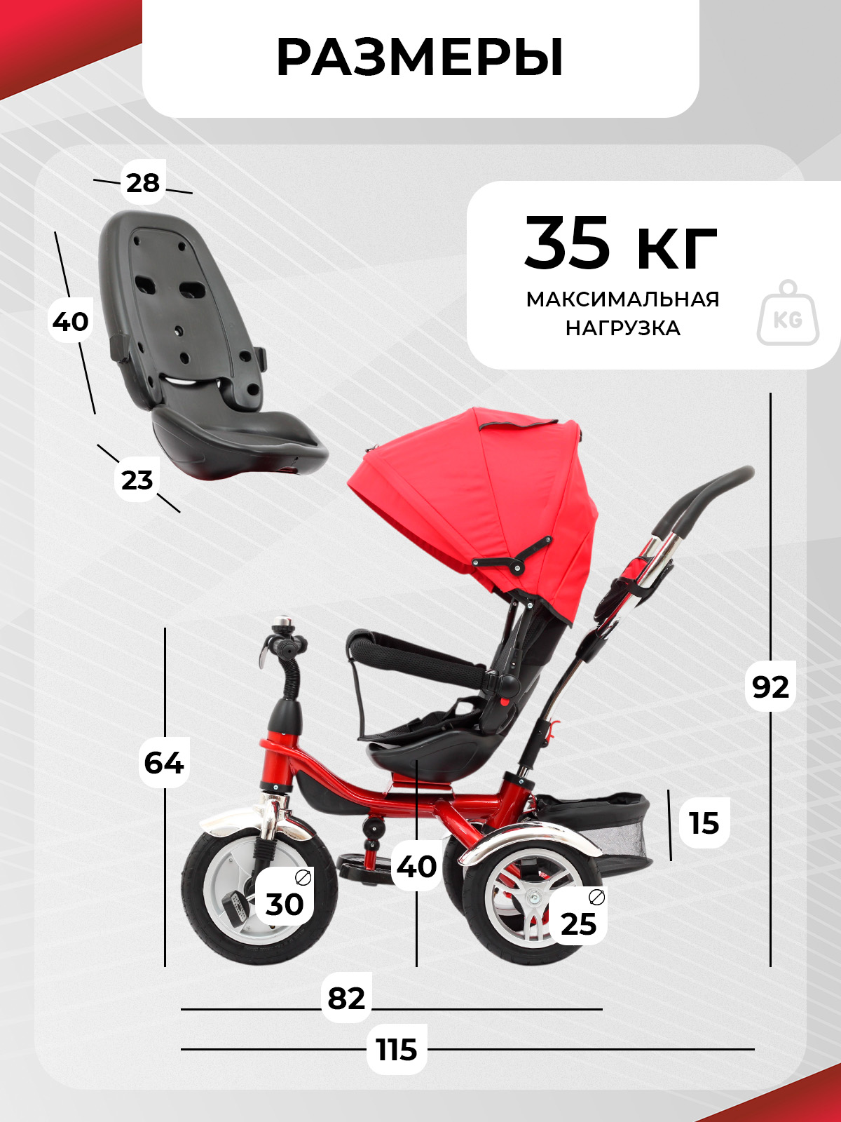 Вентилируемое окошко, Звонок, Козырек от солнца, Корзина для вещей и покупок, Мягкий защитный бампер, Подножка, Сумочка для мелочей, Поворотное сиденье на 360, Родительская ручка, Съемная обивка, Задний стояночный тормоз