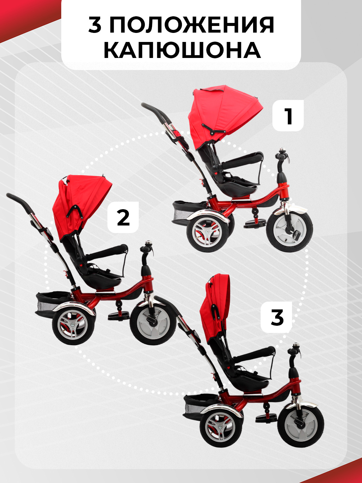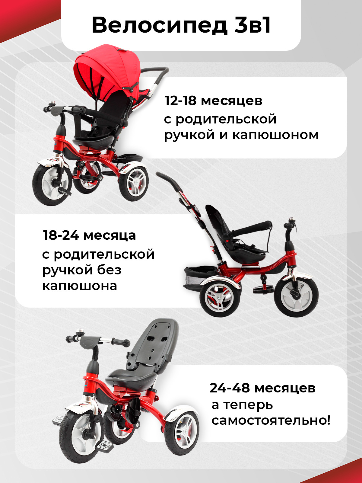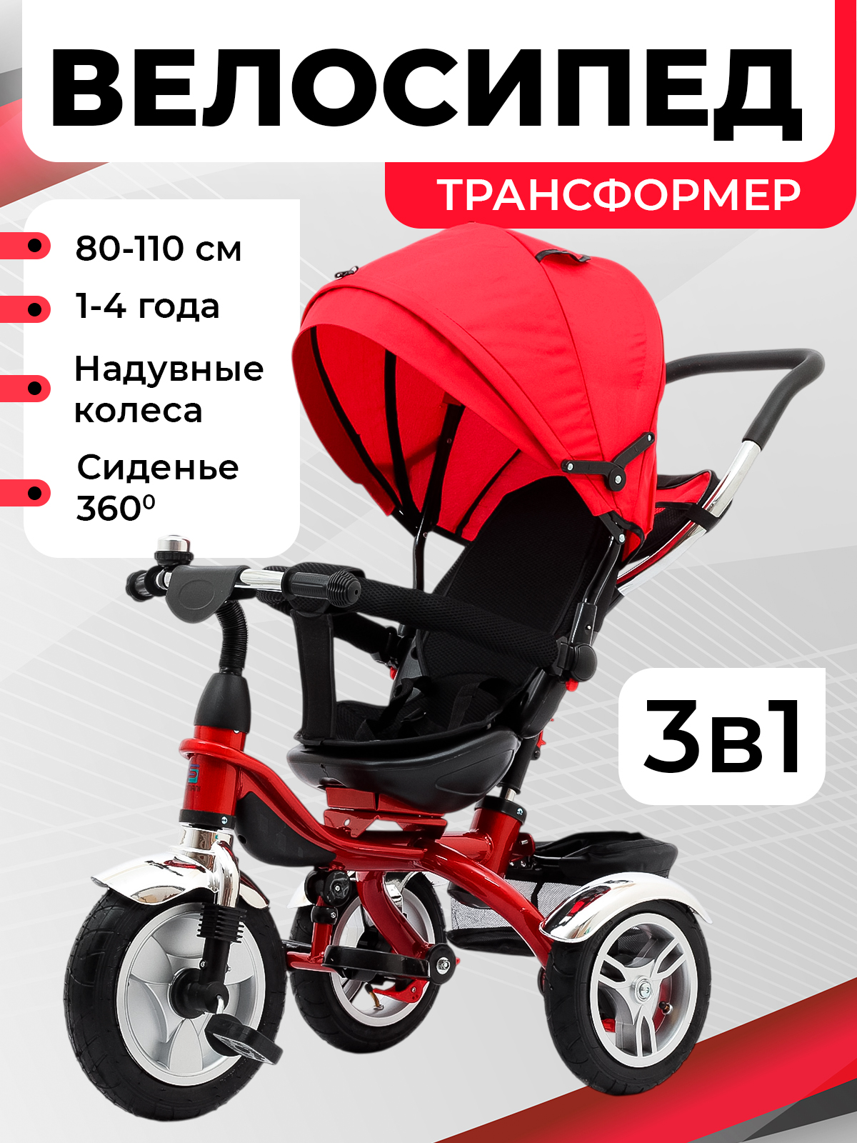Трехколесный велосипед коляска детский с ручкой для детей от 1 года до 4 лет, на рост от 80 см до 110 см. Велосипед трансформер 3 в 1 обеспечивает комфортную поездку и растет вместе с вашим ребенком, позволяя трансформировать его в обычный трехколесный велосипед. Просто снимите родительскую ручку, крышу и дугу безопасности, и у вас получится велосипед для самостоятельного катания.